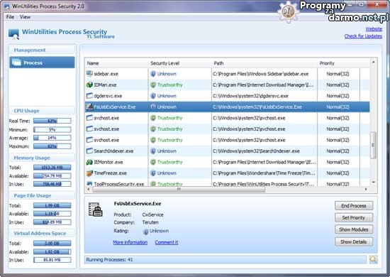 WinUtilities Process Security posiada wiele ciekawych funkcji które są niedostępne w wbudowanym system Windows Menedżerze Zadań. Program automatycznie klasyfikuje wszystkie procesy, dzięki czemu można szybko rozpoznać potencjalne zagrożenie, wyświetla szczegółowe informacje o uruchomionych procesach. Umożliwia umieszczenie podejrzanego procesu do kwarantanny i/lub wyszukanie o nim informacji także Internecie. Aplikacja posiada miły dla oka interfejs, działa prawidłowo zarówno w systemach 32 jak i 64 bitowych.