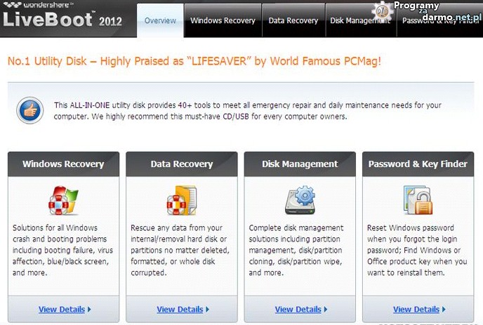 Wondershare LiveBoot 2012 – to zestaw ponad 40 narzędzi które mogą się okazać bardzo przydatne w przypadku gdy komputer odmówi nam posłuszeństwa.Znajdziemy tutaj narzędzia do diagnostyki systemu, naprawy nieuruchamiającego się systemu Windows, przywracania ( odzyskiwania ) danych, tworzenia kopii ( klonowania ) partycji/dysków/nośników wymiennych, kasowania partycji, tworzenia nowych partycji, łączenia, dzielenia partycji, resetowania zapomnianego hasła do systemu Windows, pakietu Office.