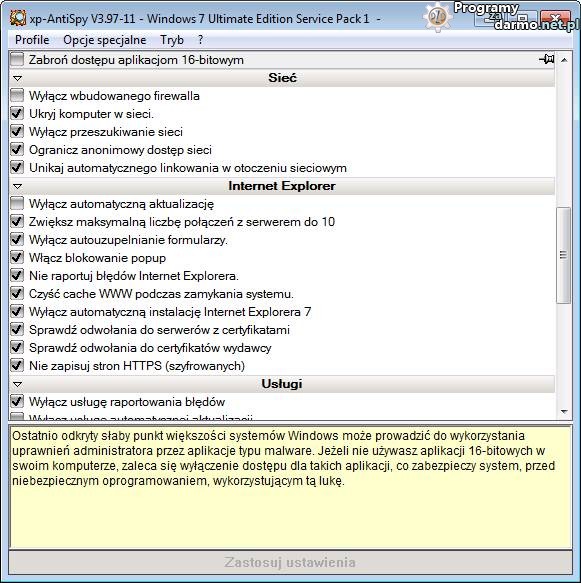Program także umożliwia tworzenie własnych profili ustawień, warto utworzyć profil domyślnych ustawień przed zabawą z programem.xp-AntiSpy nie wymaga instalacji (dostępna wersja portable) i posiada interfejs w języku Polskim :D.